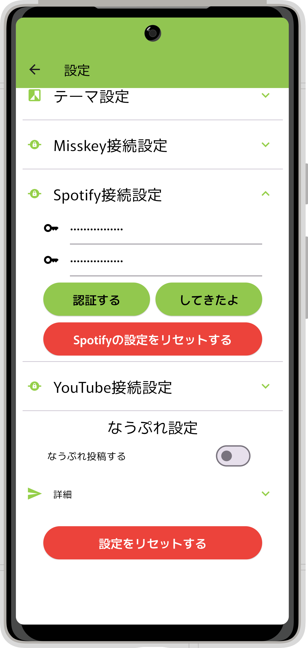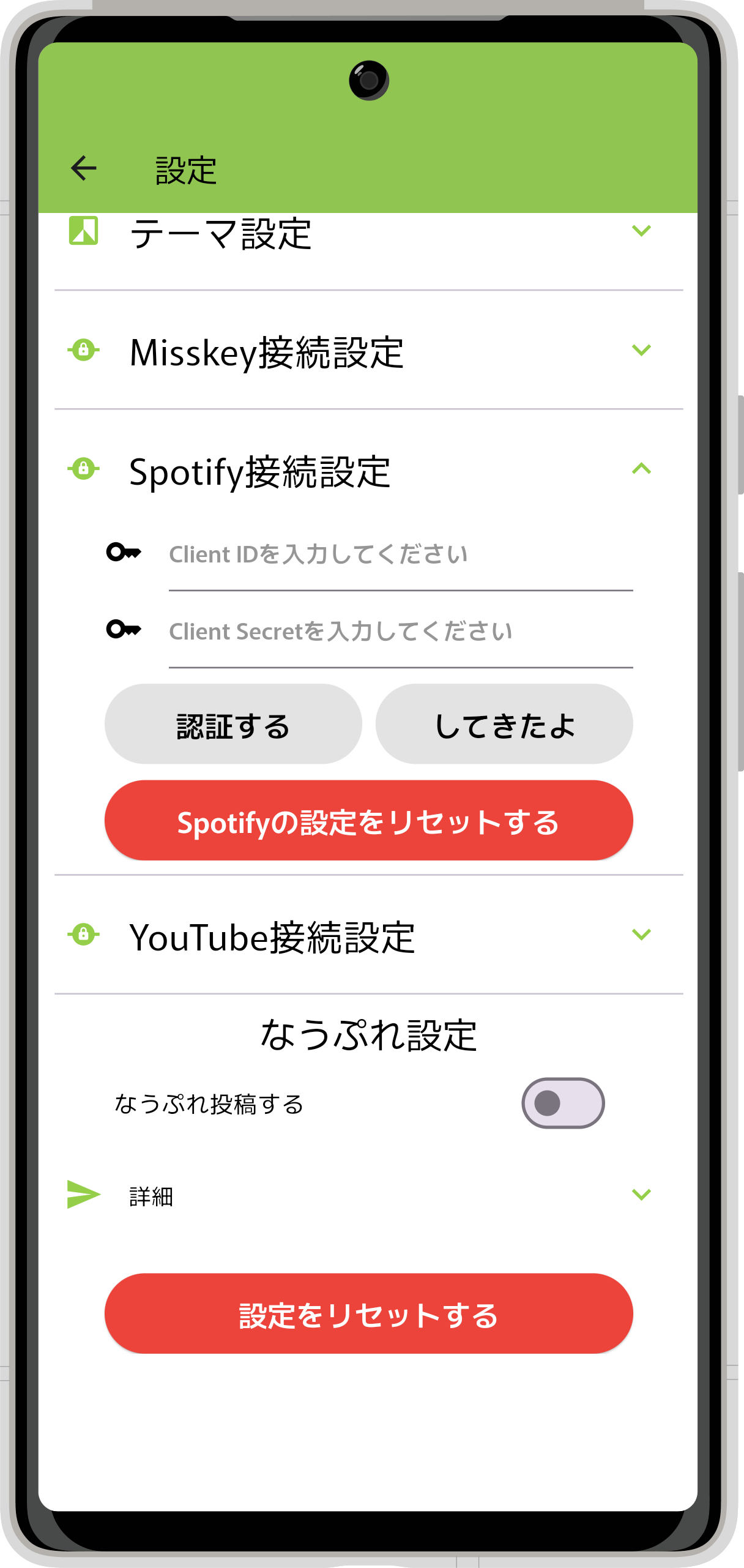 - のSpotify接続設定を押下して、設定項目を展開してください。