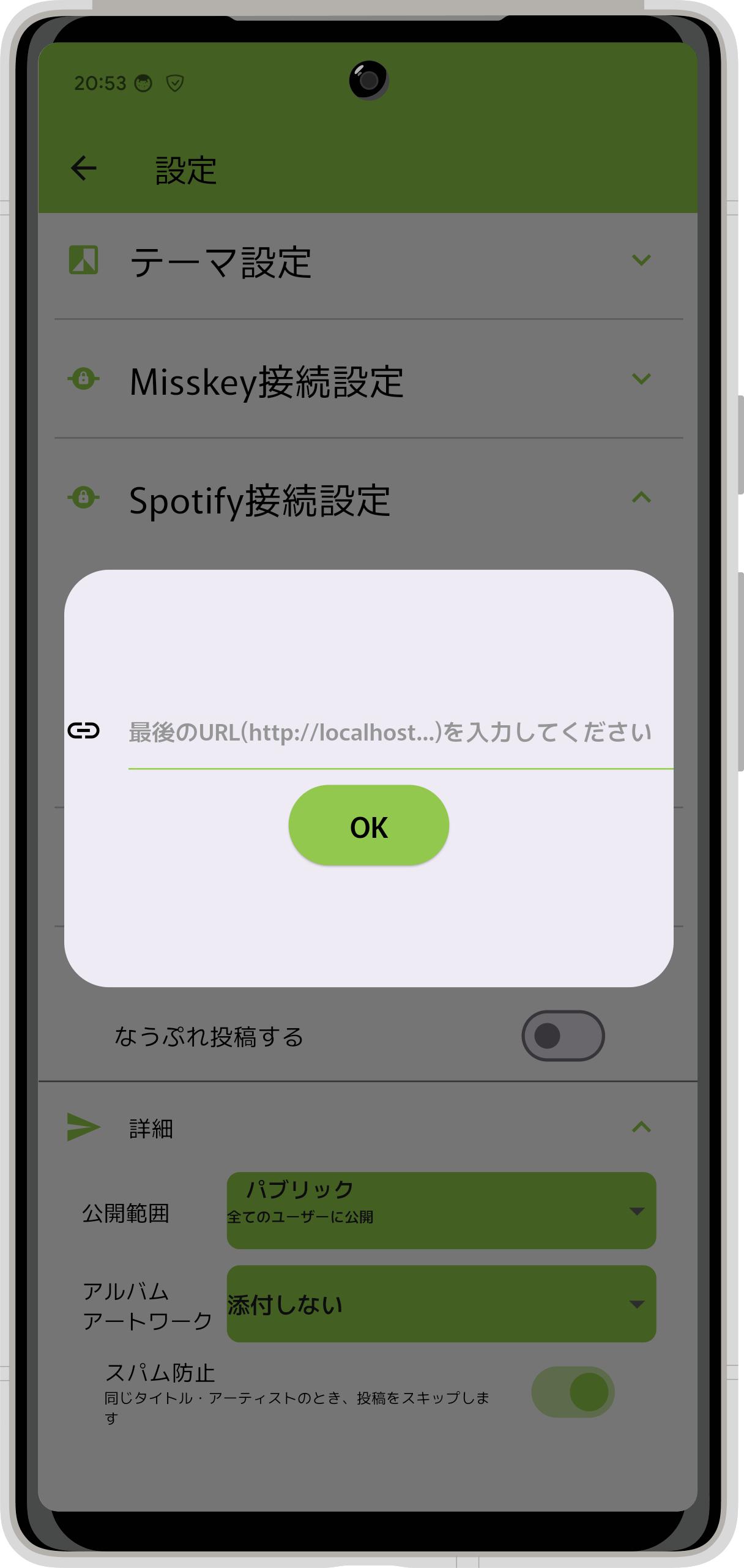 - Spotify接続設定のしてきたよボタンを押下してダイアログを表示し、控えたURLをペーストしてOKボタンを押下してください。