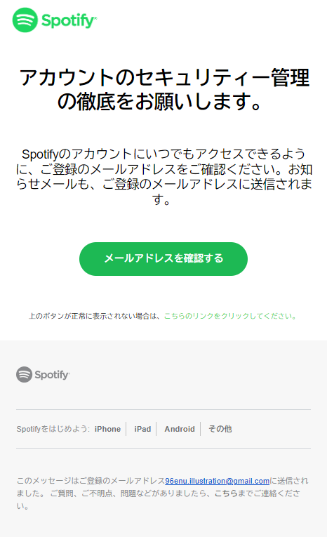 no-reply@spotify.comから以下の図のようなセキュリティ確認のメールが送信されるので、メールアドレスを確認するを押下してください。
