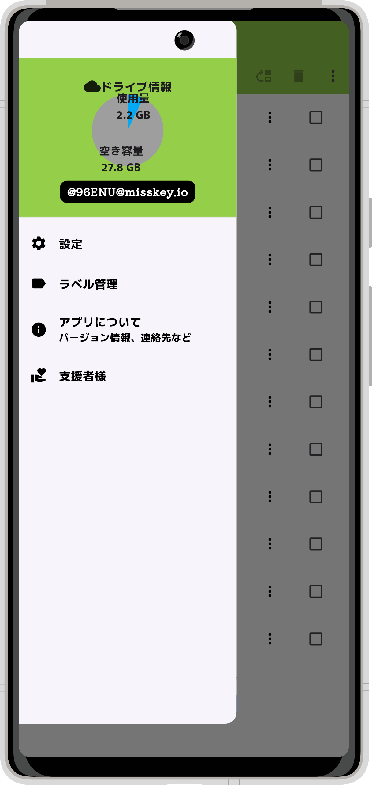 こちらのページの手順に沿ってMisskeyとのアカウントの連携を完了すると、のにドライブの使用量についての円グラフが表示されます。